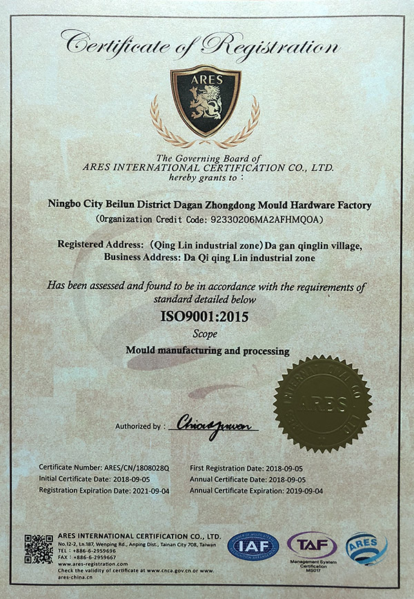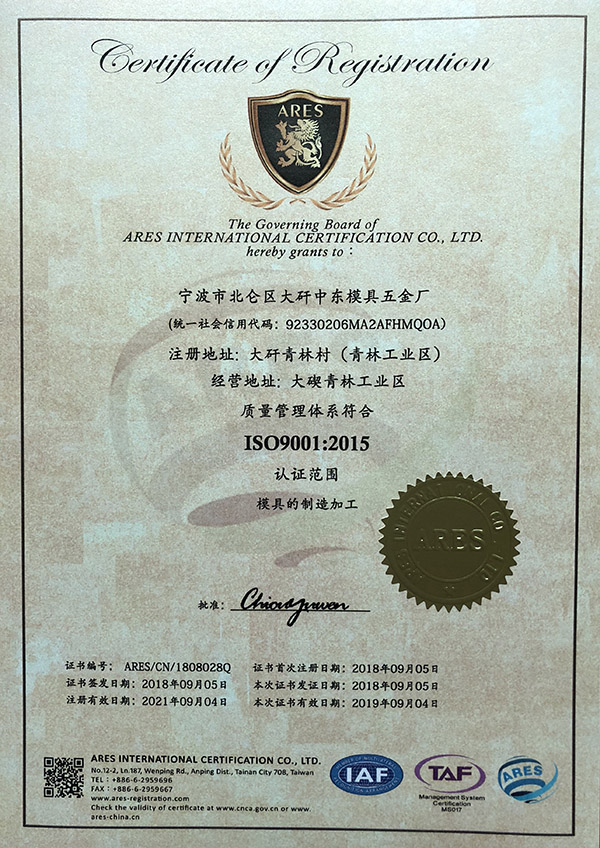 公司已通过ISO9001:2015质量管理体系认证,本公司一直秉承质量为本的模具制造理念,不断完善质量控制体系,竭力为客户提供高品质,具有竞争力的产品,进一步加深客户的信任。